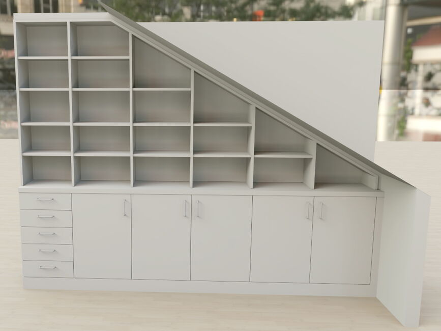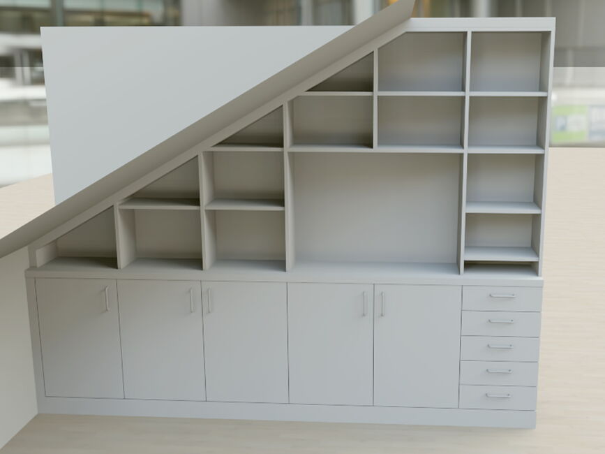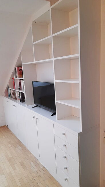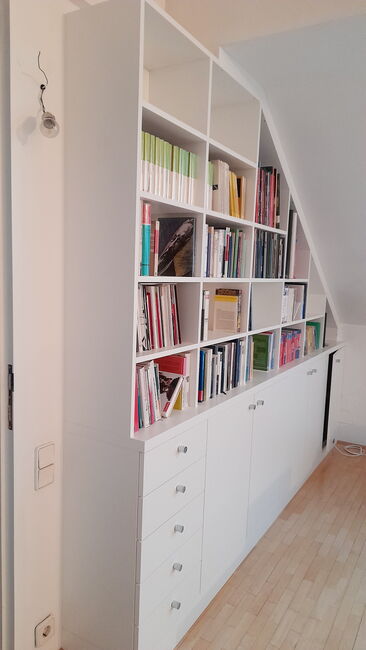 Die Nutzung als Stauraum im Büro entsprach den Erwartungen, das Möbel hat in die schräge Mauernische gepasst. Es gibt 2 gegenüberliegende Möbel