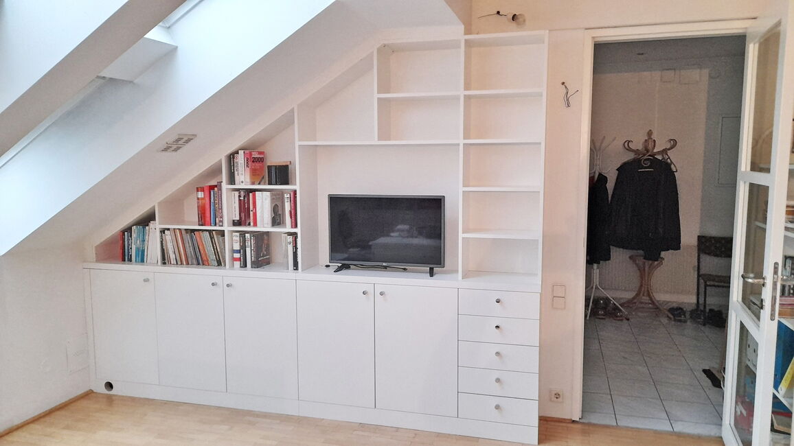 Der Stammkunde wollte sein Dachgeschoßbüro optimieren und neue, an den Raum angepasste Möbel. Wir haben eine 3D Planung erstellt und die Möbel grafisch dargestellt. Nach Einverständnis der Kunden erfolgte Produktion und Lieferung. Die Lieferung in den 6.Stock war auf Grund der Teilegrößen nur teilweise mit dem hauseigenen Lift möglich.