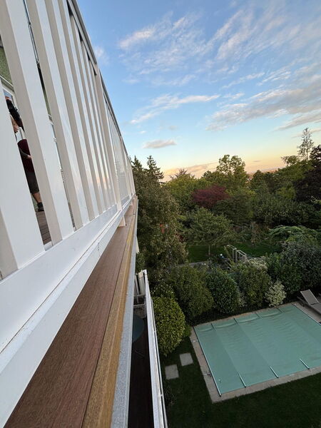Das spezielle an der Terrasse der Kundin: Durch die Lage am Brunner Berg ist eine freie Sicht bis Hainburg und an klaren Tagen bis Bratislava gegeben. Auf jeden Fall ist das Kloster St. Gabriel immer im Blickpunkt. So lässt es sich bei schönem Wetter relaxen.