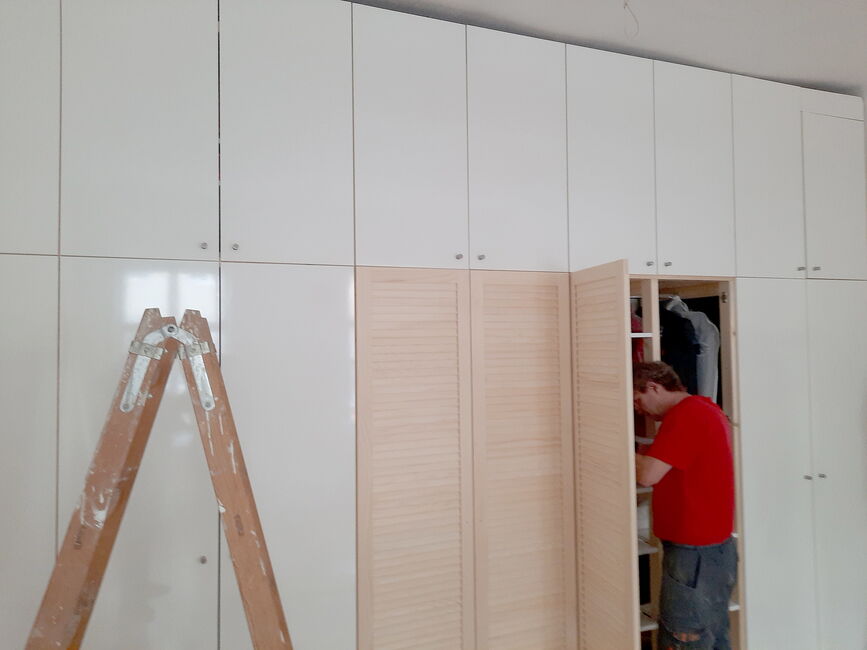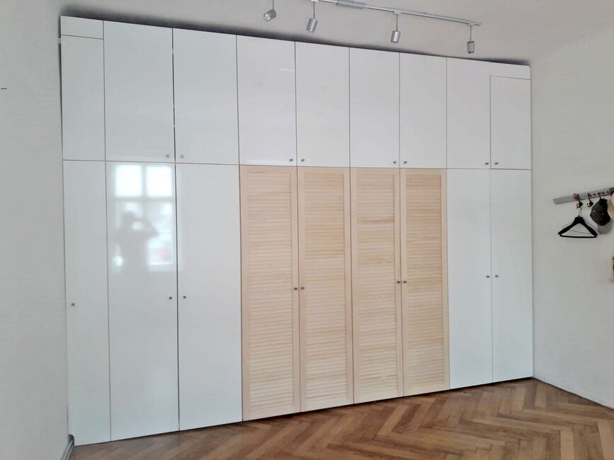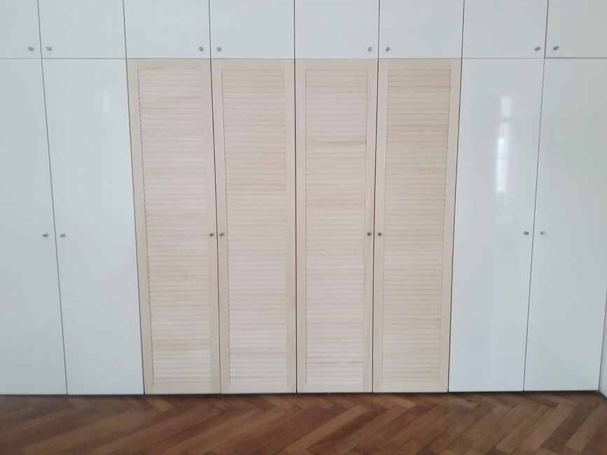 Die Konstruktion wurde aufgebaut, eingerichtet und mit Türen aus weiss glänzenden Dekorplatten (Fundermax 85GL) und in der Mitte als optischen Aufputz mit Lamellentüren in Fichte ausgestattet. Die Lamellentüren wurden nach Maß von einem unserer Partner für diesen Auftrag speziell hergestellt.