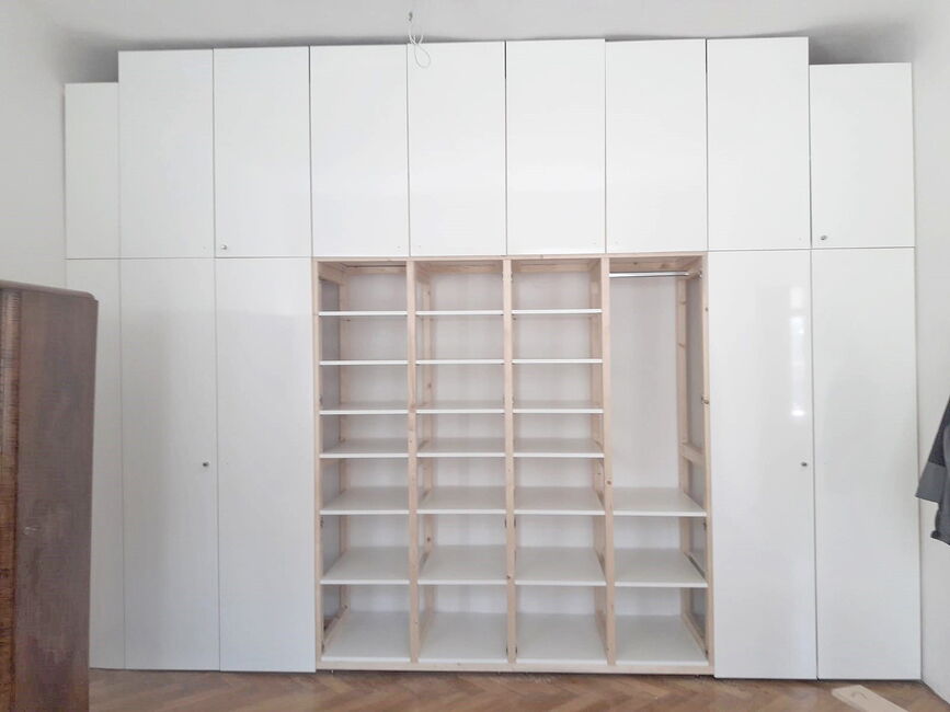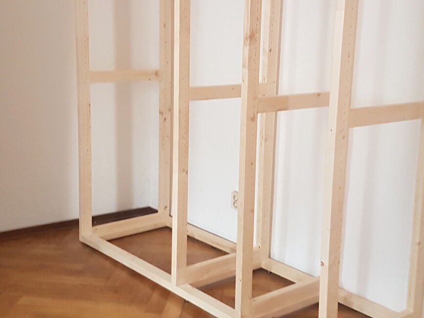 In Mödling wurde ein ungewöhnlicher Kundenwunsch erfüllt. Ein Stauraumschrank in einem Altbau sollte nicht wie gewöhnlich aus Spanplattenseiten konstruiert werden, sondern aus einem Fichtenholzgerüst gebaut sein.