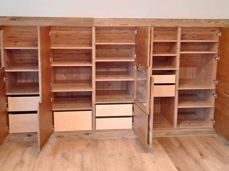 Die Möbel wurden exakt in die Dachschrägen eingepasst und haben Laden, die bis zu 80cm tief sind. Türen und Ladenvorderstücke wurden aus Fichten-Altholz gefertigt.